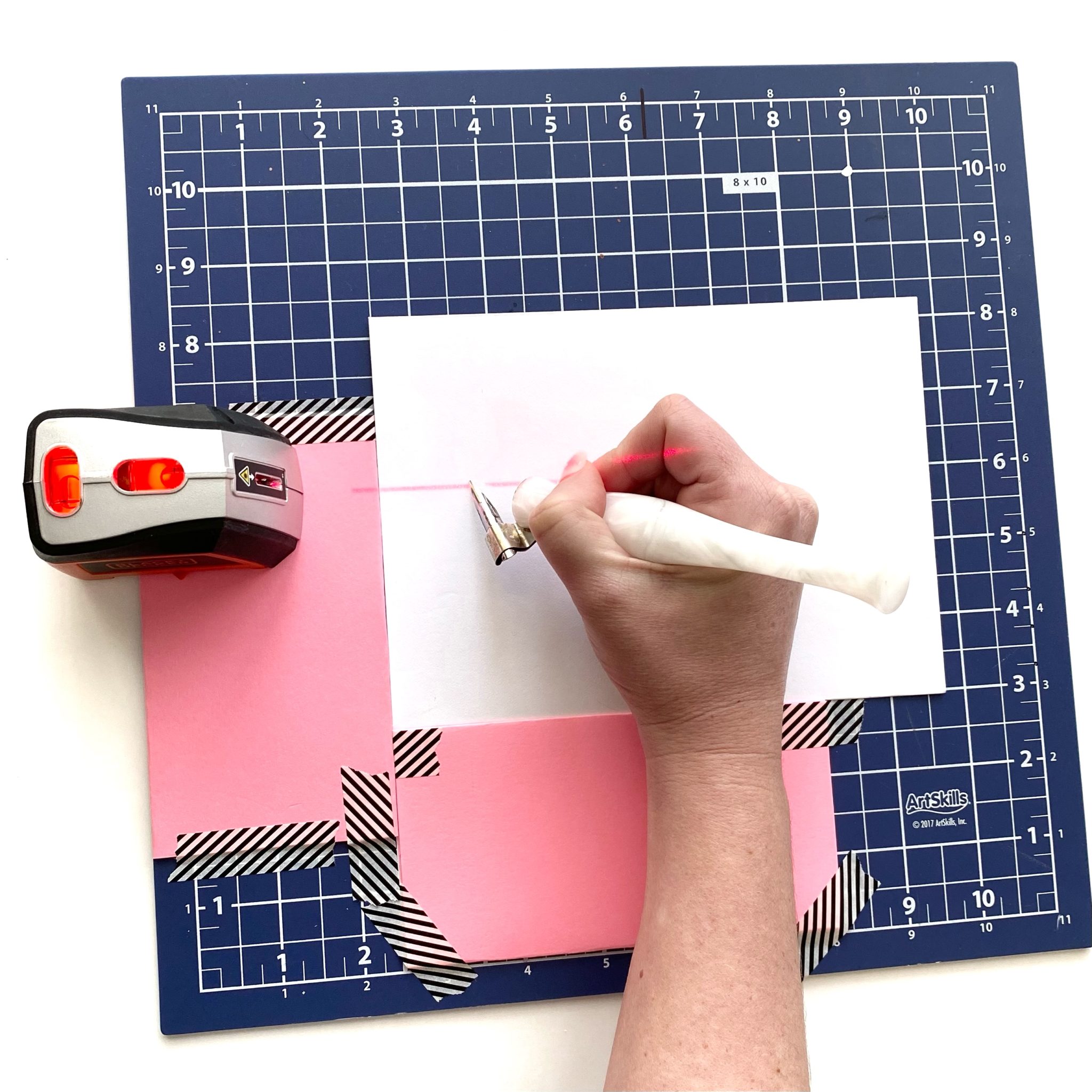 I like to use a clear see-through clipboard on top of my grid sheet cutting mat. If you don’t have a clipboard handy, you can always fold up some heavy card stock and tape it to your grid sheet so the envelope sits nicely against the card stock and doesn’t move, see below the pink paper taped down. (Not the prettiest way to do things, but it works!)