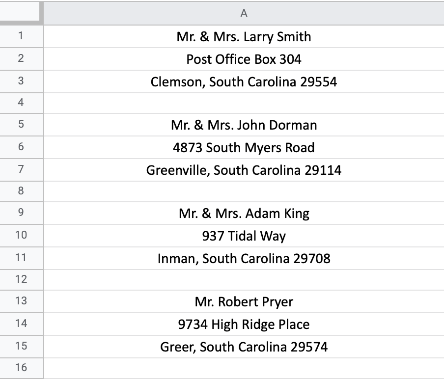 Once they have their guest lists finalized, ask your client to send the address list to you in excel or google sheets and format them centered. This will help tremendously when it comes to actually writing them because you’ll be able to visualize the spacing of each line as you write. The centering is a MUST (as opposed to an excel sheet with the info in horizontal rows) so you know exactly where to start your next line.
