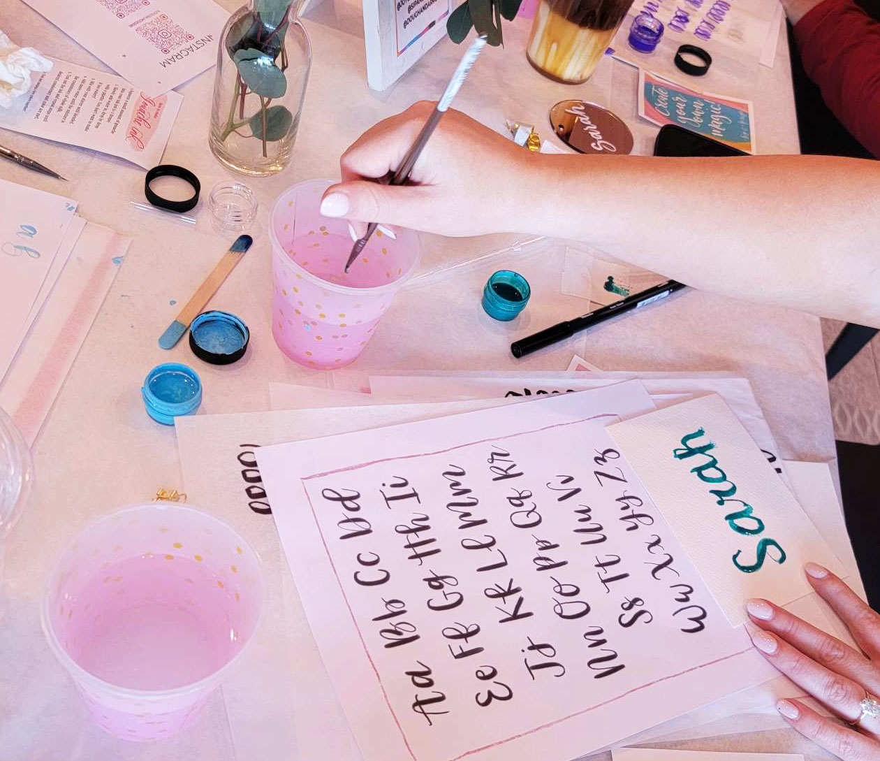 Class includes 1.5 hours of instruction and demonstration, our beginner’s brush lettering kit (watercolor paper, tracing paper, our Brush Lettering Guides Bundle, a Tombow Brush Marker, a round paintbrush, an inkpot pre-filled with gouache, and a pipette), and all materials to write on. Everything is yours to keep at the end of the class! Your ticket purchase also includes one drink of your choice at Mudleaf!
