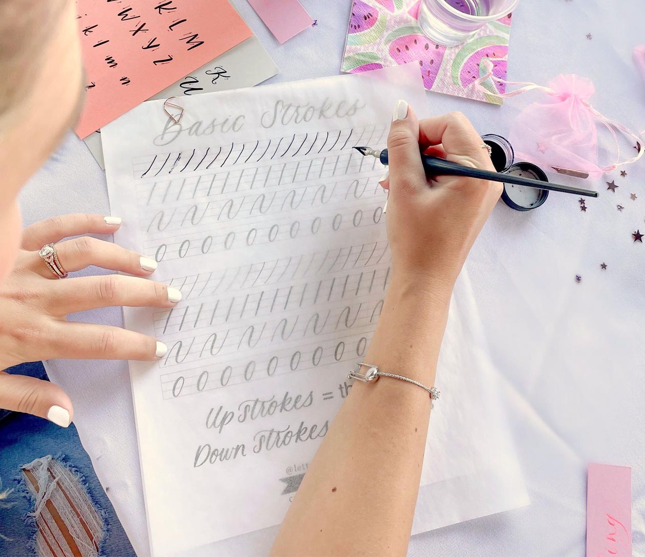Class Expectations: Yes, lefties are welcome too! This class is encouraged for someone who has never taken a calligraphy class before. We teach the basics and our expectation for you is to have ink flowing through your nib with enough confidence to be able to practice way beyond class. We love using tracing paper with our guides to help you build muscle memory and develop your own style! If you have tried calligraphy out before, this class will be a great refresher and hopefully a chance to try some new supplies from our beginner kit that will re-introduce you to this lovely form of art!