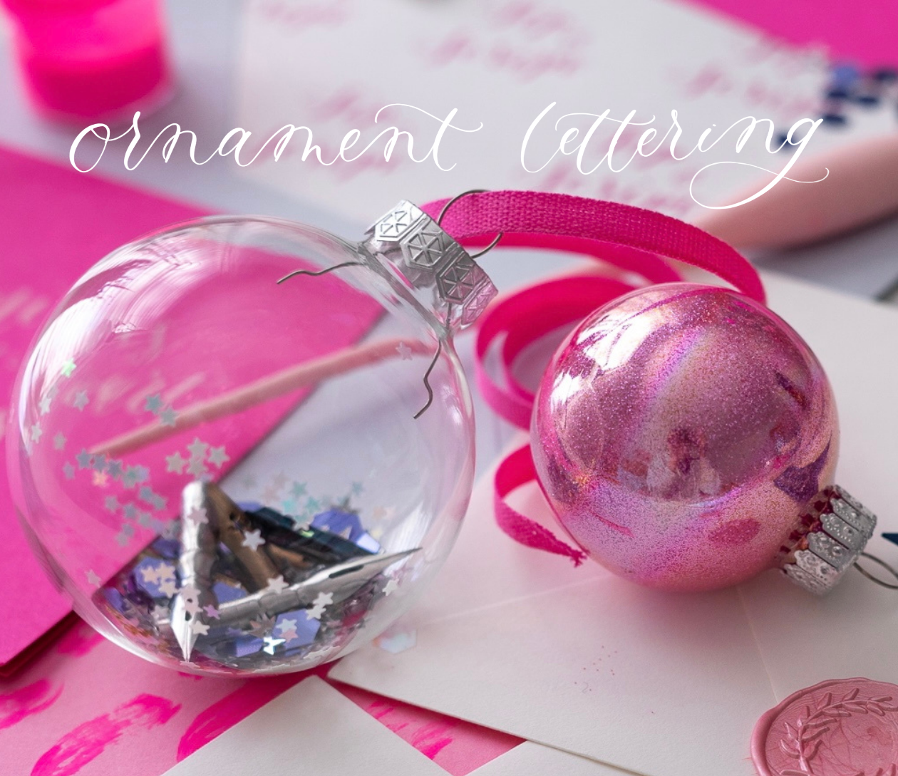 Class includes 1.5 hours of instruction and demonstration, our beginner’s calligraphy kit (two nibs, black ink pot, 2 letter guides, tracing paper and straight pen holder), and all materials to write on. Everything is yours to keep at the end of the workshop! Additionally, we will be lettering on a take-home acrylic ornament at the end of our class time!