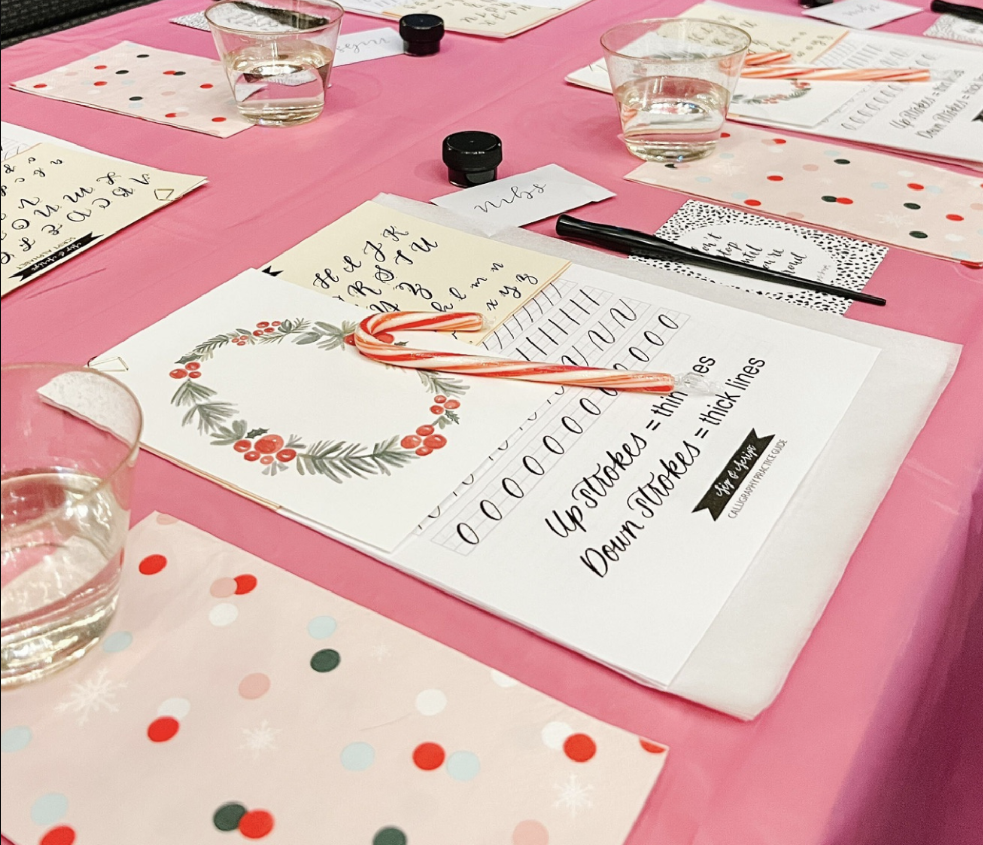 Class includes 1.5 hours of instruction and demonstration, our beginner’s calligraphy kit (two nibs, black ink pot, 2 letter guides, tracing paper, and straight pen holder), and all materials to write on. Everything is yours to keep at the end of the workshop! Additionally, we will be lettering on a take-home acrylic ornament at the end of our class time!