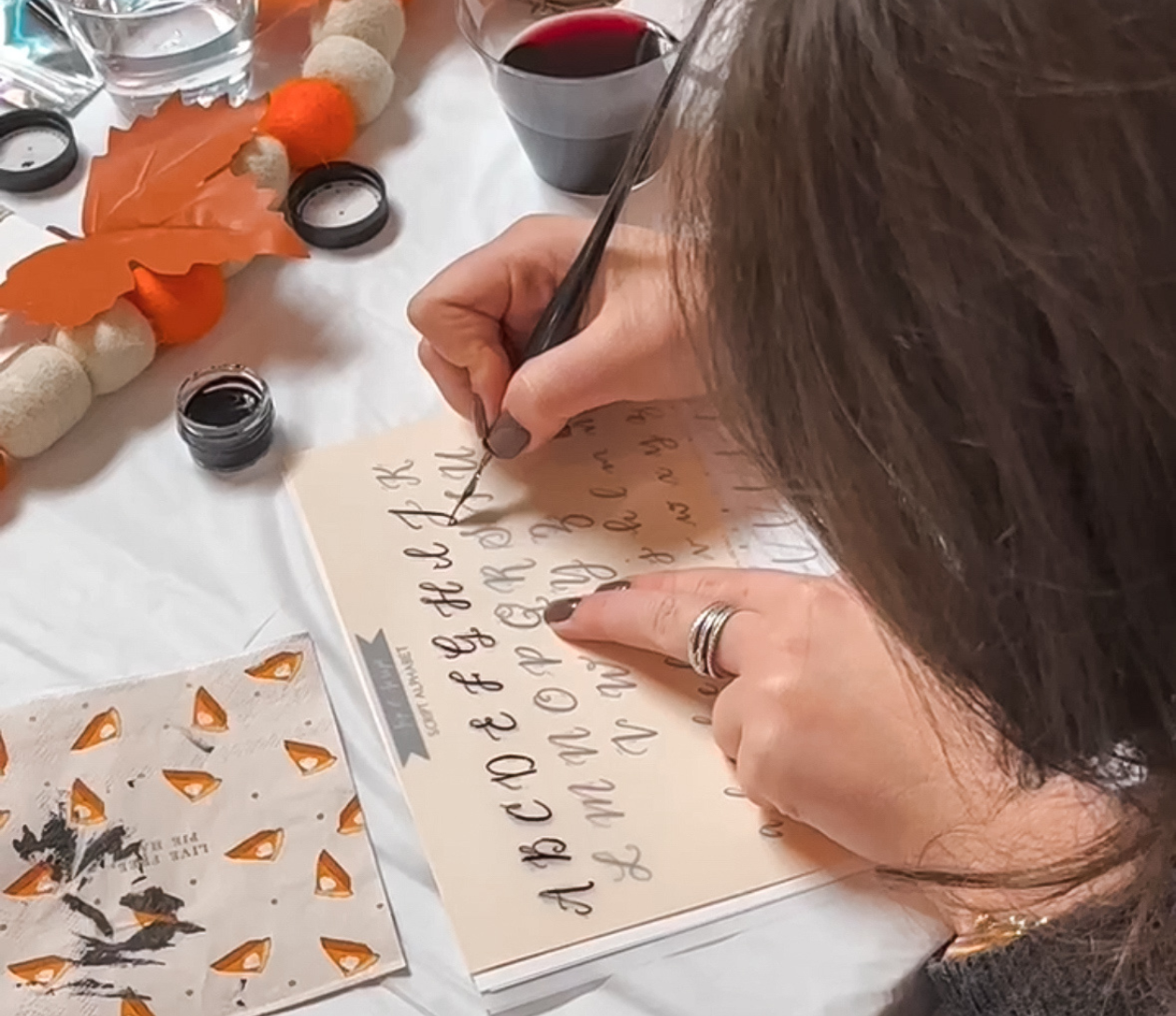 Class includes 1.5 hours of instruction and demonstration, our beginner’s calligraphy kit (two nibs, black ink pot, 2 letter guides, tracing paper, and straight pen holder), and all materials to write on. Everything is yours to keep at the end of the workshop!