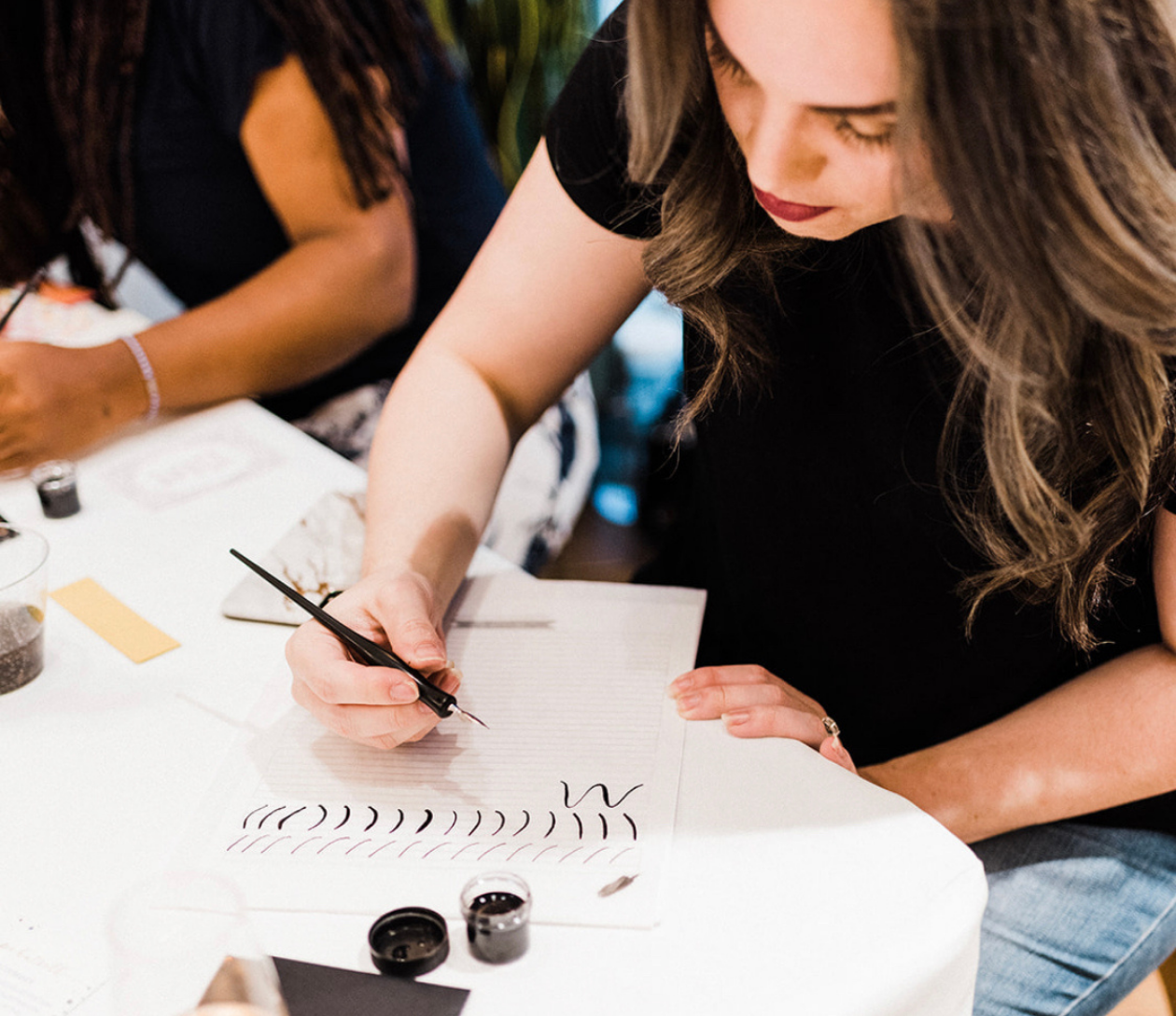 Class includes 1.5 hours of instruction and demonstration, our beginner’s calligraphy kit (two nibs, black ink pot, 2 letter guides, tracing paper, and straight pen holder), and all materials to write on. Everything is yours to keep at the end of the workshop!