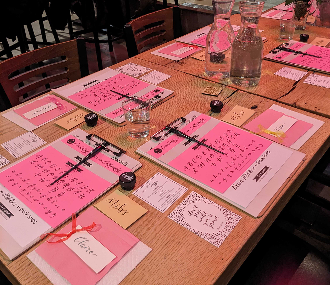The perfect crafty afternoon out! Class includes 90 minutes of instruction and demonstration, our Beginner’s Calligraphy Kit (a pen holder, two different nibs, black ink, two letter guides, and tracing paper), plus a bonus “Paper Bar” with themed paper, and all materials to practice writing on. Everything is yours to keep at the end of the workshop!