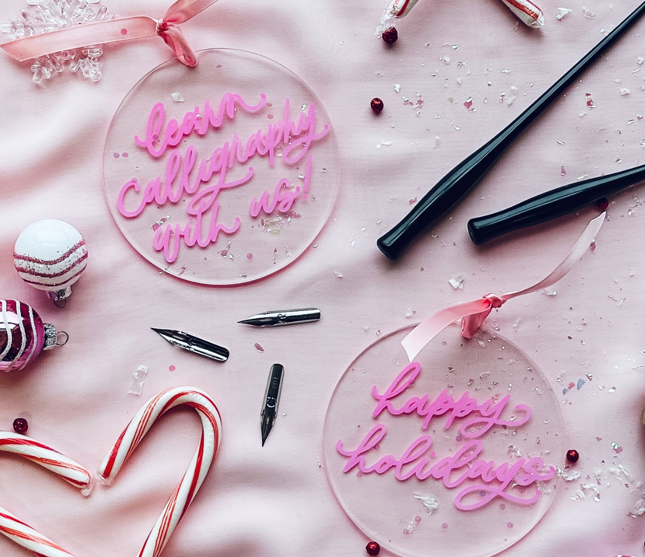 Class includes 1.5 hours of instruction and demonstration, our beginner’s calligraphy kit (two nibs, black ink pot, 2 letter guides, tracing paper and straight pen holder), and all materials to write on. Everything is yours to keep at the end of the workshop! Additionally, we will be lettering on a take-home acrylic ornament at the end of our class time!