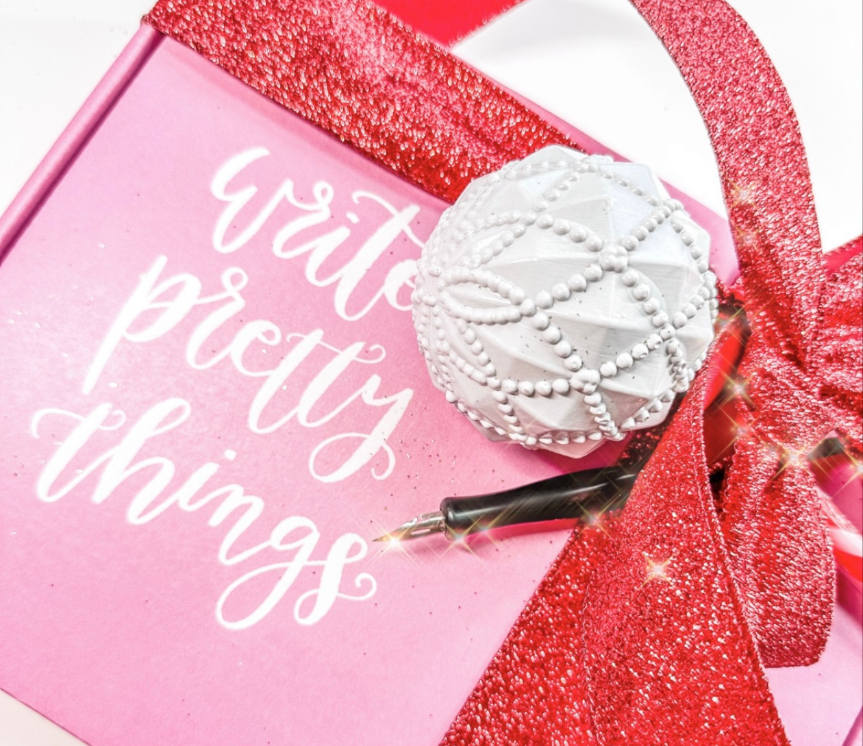 Class includes 1.5 hours of instruction and demonstration, our Beginner’s Calligraphy Kit (straight pen holder, two nibs, black ink, two letter guides, tracing paper), and all materials to write on. Everything is yours to keep at the end of the workshop! Additionally, we will be lettering with brush pens, paint pens, and markers on a take-home acrylic ornament at the end of our class time!