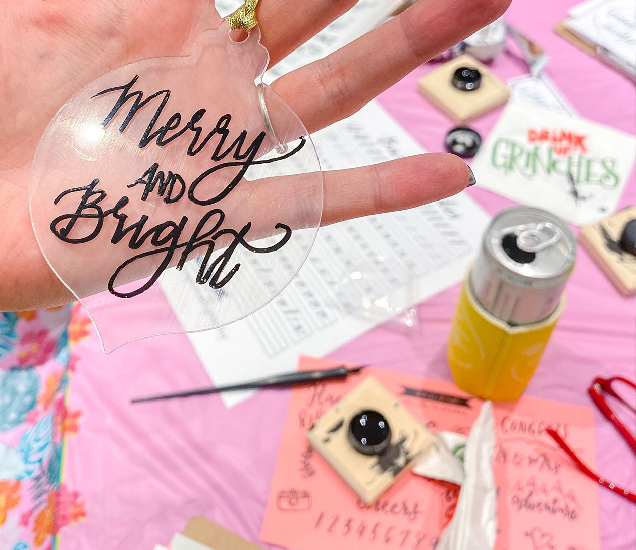 Class includes 1.5 hours of instruction and demonstration, our beginner’s calligraphy kit (two nibs, black ink pot, 2 letter guides, tracing paper and straight pen holder), and all materials to write on. Everything is yours to keep at the end of the workshop! Additionally, we will be lettering on a take-home acrylic ornament at the end of our class time!