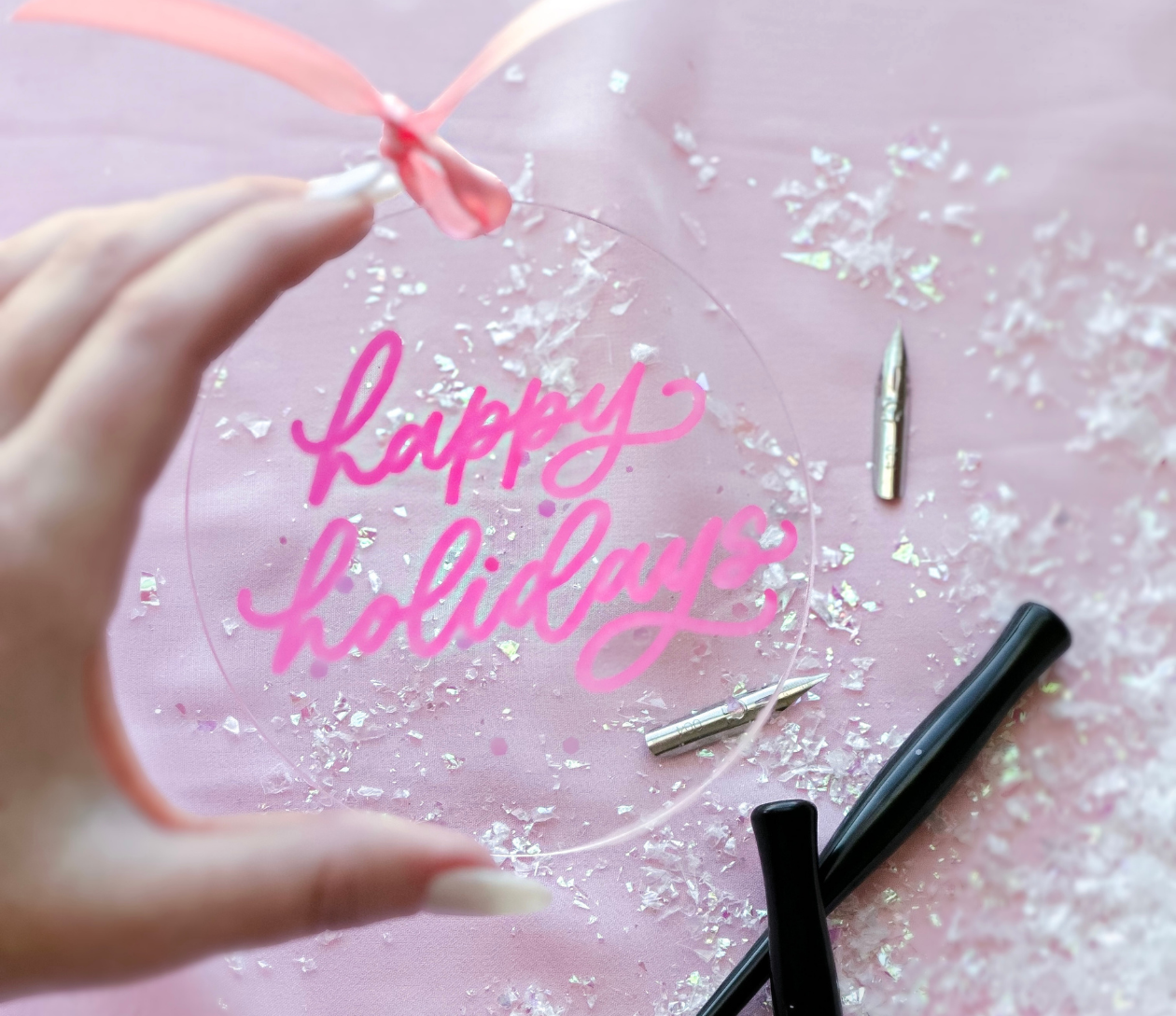 Class includes 1.5 hours of instruction and demonstration, our beginner’s calligraphy kit (two nibs, black ink pot, 2 letter guides, tracing paper and straight pen holder), and all materials to write on. Everything is yours to keep at the end of the workshop! Additionally, we will be lettering on a take-home acrylic ornament at the end of our class time!