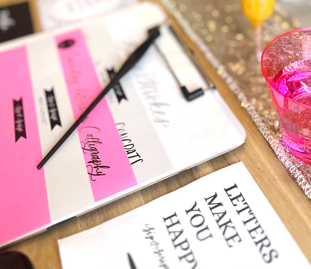- Beginner calligraphy kit (two nibs, ink pot, letter guides, tracing paper, pen holder)